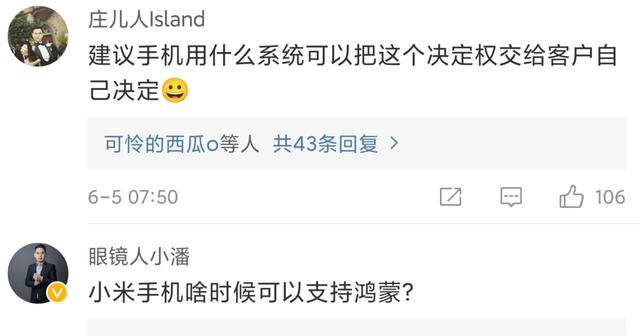 再看小米,从始至终小米从并未对鸿蒙发表任何看法,更没有任何的迹象表明小米会搭载鸿蒙。不过网友非常关心小米是否会搭载鸿蒙,纷纷到雷军的微博评论区留言。有网友表示建议把用什么系统的决定权交给用户。还有网友询问小米手机何时支持鸿蒙。